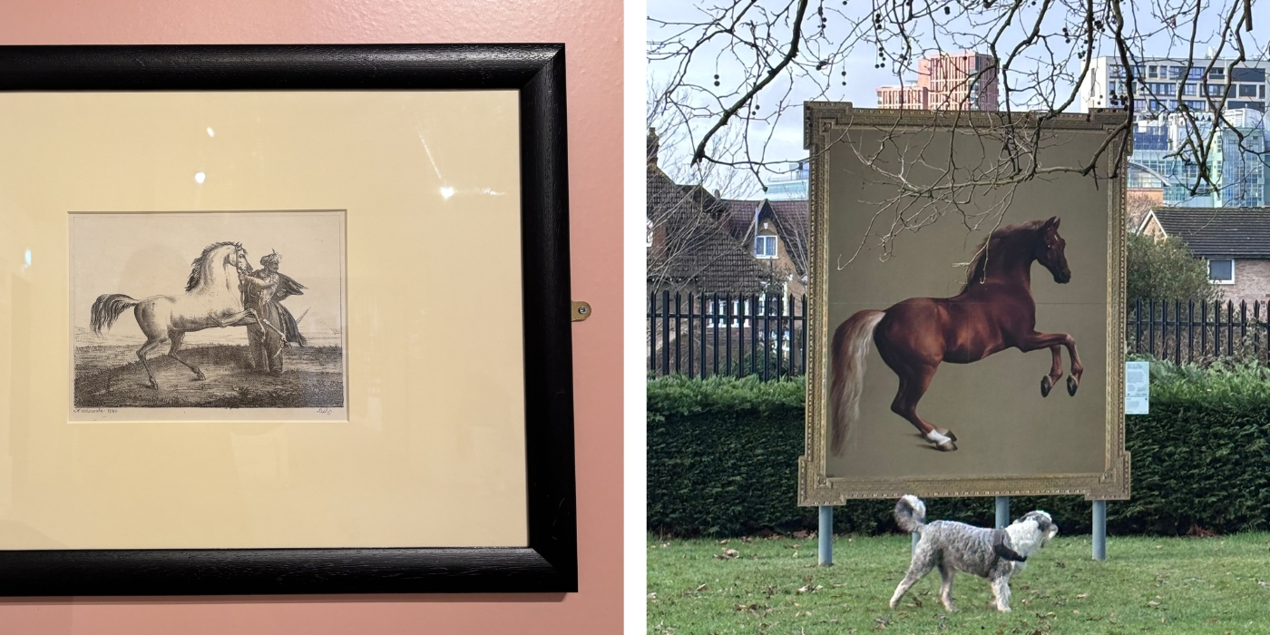 The ‘mini’ drawing titled ‘A Moor and his horse’ by W. B. Goodfellow (date not known) has (of course) been paired with the gigantic ‘Whistlejacket’ by Stubbs (1724-1806) which you won’t be able to miss, by the café in Park Hill Park. (I love the humour of this little and large equine pairing).