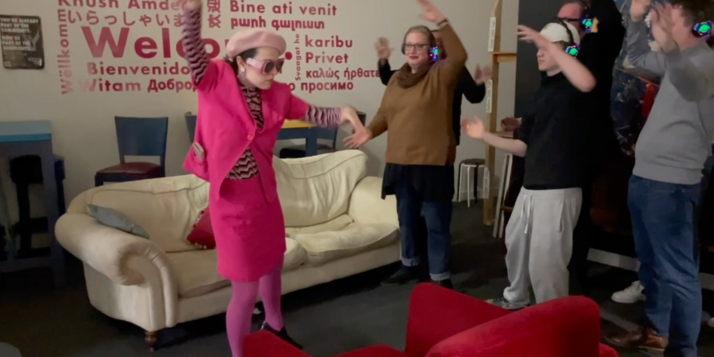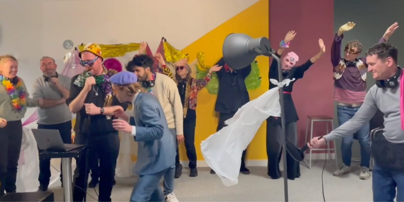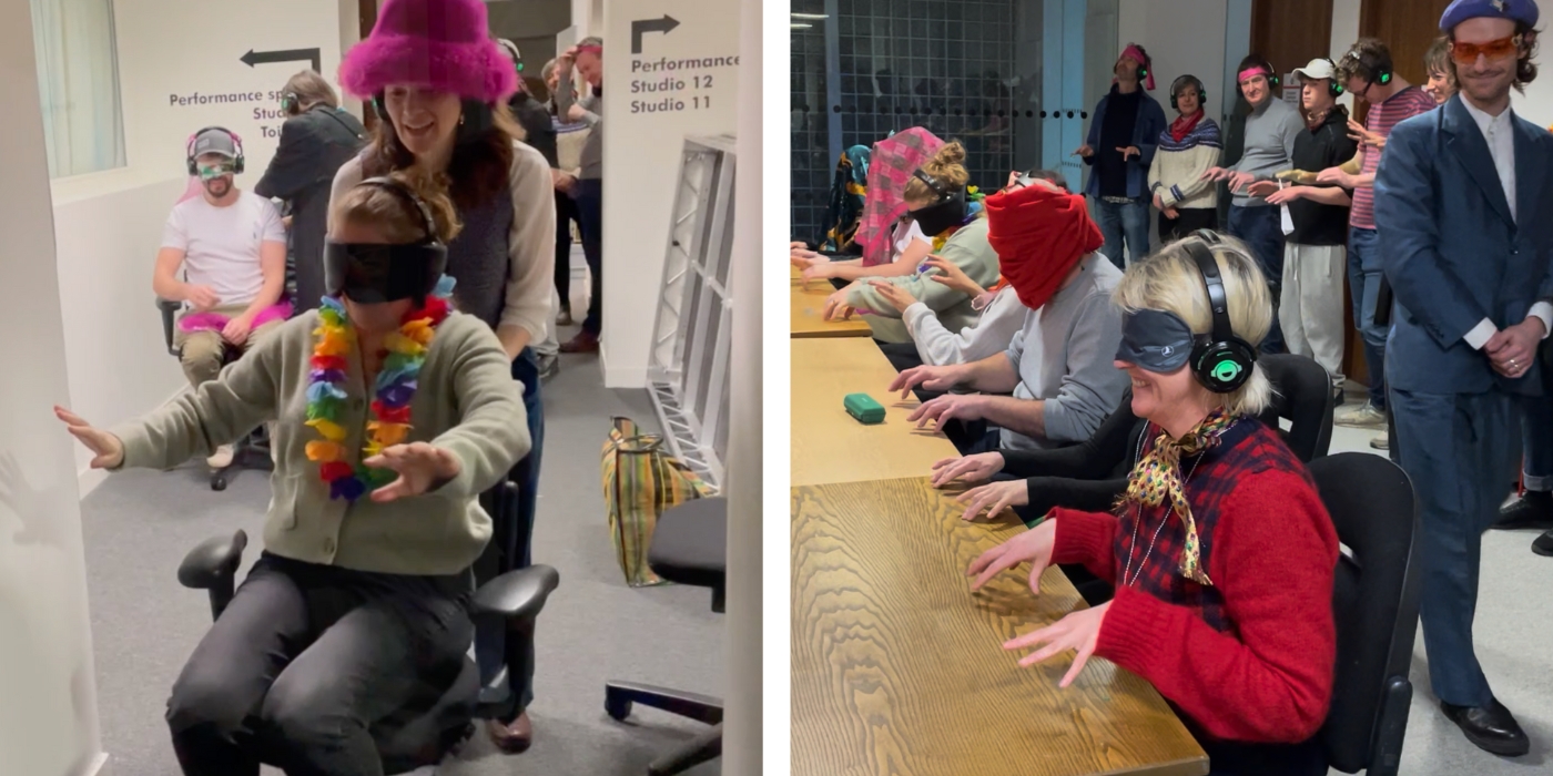 Simone: You can expect to move through different spaces, to be wheeled around on office chairs that become our Train, blindfolded, and wearing silent disco headphones. There’ll be singing, dancing, laughter, and a wonderfully wacky sense of humour, all powered by the communal spirit of the audience coming together to help us pull off this big, ambitious vision: an immersive theatre show gone wrong, with AI stepping in to try and fix it.